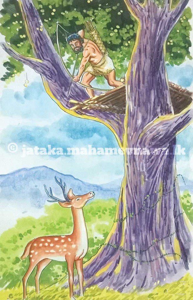 බෝධිසත්වයොත් ඇත්දෙමට ගෙඩි කන්ට ඕනෑ කියලා උදෑසනින් ම එතැනට ගියා. නමුත් එක්වරටම ගහට ළං වුනේ නෑ. අට්ටාල වැද්දන් මේ ගහෙත් අට්ටාල බැඳගෙන ඉන්ට බැරි නෑ කියලා කෝකටත් කල්පනාවෙන් වටපිට බැලුවා. මුවා ඈත සිටන් ගහ දිහා බලන් ඉන්නවා විතරයි. ළඟට පැමිණීමක් නෑ. වැද්දත් බලාගෙන සිටියා. මුවා එන පාටක් නෑ. එතකොට වැද්දා මුවාව ළඟට ගෙන්නා ගන්ට හිතලා සැඟවී සිටියදීම ඇත්දෙමට ගෙඩි කඩ කඩා මුවාගේ පැත්තට වීසි කළා. බෝසත් මුවා මෙහෙම හිතුවා. ‘හෑ…. හරි වැඩක් නොවැ… මෙතෙක් කලක් මා ඉදිරියට මෙහෙම ගෙඩි වැටුනේ නෑ. අද මොකෝ මේ මහ ආදරයකින් වගේ ගෙඩි ළඟටම එන්නේ…’ හිතලා හොඳ හැටියට විපරම් කළා. එතකොට ඇත්දෙමට ගහේ අට්ටාලේ සැඟවිලා තමන් දෙසට කුරුමානම් අල්ලන වැද්දාව දැක්කා. දැකලා නොදැක්කා වගේ මෙහෙම කිව්වා. “හනේ…. හනේ…. එම්බල වෘක්ෂය…. මීට කලින් මෙහෙම දෙයක් වුනේ නෑ නොවැ. තොපගේ වෘක්ෂයේ එල්ලී තියෙන ගෙඩි වැටුනොත් කෙලින් අතටම බිමට වැටුනා. අද මොකෝ මේ පැත්තට ඇලවෙලා මේ පැත්තට ගෙඩි වීසිවෙන්නේ? තෝ පැරණි වෘක්ෂ ධර්මයට විරුද්ධව ගියාද? තෝත් එහෙනම් තමන්ගේ වෘක්ෂ ධර්මයට විරුද්ධව ගියා නම් මාත් ඔය ගස යටට එන්නේ නෑ. වෙන ගසක් හොයාන යනවා” කියලා මේ ගාථාව පැවසුවා.