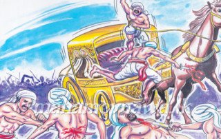 ආජානේය අශ්වයෝ දෙන්නා යුද ඇඳුමෙන් සරසවා රථයේ යෙදෙව්වා. මහා යෝධයාත් සන්නාහයෙන් සන්නද්ධව රථයට නැංගා. එක එක බලකොටුවට කඩාපැන්නා. සයවෙනි රජාව අල්ලාගත් වේලේ වැඩිමහල් අශ්වයා මාරාන්තික සතුරු ප්රහාරයකට ලක්වුනා. නමුත් අශ්වයා ලේ වැගිරෙද්දි රථය ප්රමාද කළේ නෑ. රජ මිදුලට ම ආවා.